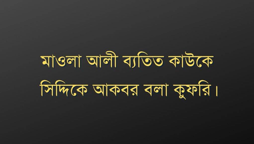 আফসোস আপনাদের মোয়াবিয়া-ইয়াজিদ হাজার হাজার জাল হাদিস তৈরি করলেও, হযরত আবু বকরকে সিদ্দিকী আকবর বানাইতে ভুলে গেছে। এই ভুলের জন্য মোয়াবিয়া ও ইয়াজিদের উপর লানত দিতে পারেন। হায়রে অন্ধ, বধির, অজ্ঞ ও অবিবেচক মানুষ এখনো সময় আছে, আর মাওলা আলীর বিরোধিতা করিয়েন না। তাহলে ইহকাল এবং পরকাল দুটিই ধ্বংস অনিবার্য। আল্লাহর সাথে কাউকে শরিক করা যেমন শিরকি গুনাহ। ঠিক তেমনিভাবে পাক পাঞ্জাতনের মর্যাদা, সম্মান ও শ্রেষ্টত্বের সাথে কাউকে তুলনা করা অথবা বেশি মনে করা সরাসরি কুফরি গুনাহ। মনে রাখবেন পাক পাঞ্জাতন সৃষ্টির মূল এবং সৃষ্টির উৎস। মনিবের সাথে কখনো গোলামের তুলনা হয় না। গোলাম চিরকাল গোলামই থাকে, গোলাম কখনো মনিব হতে পারে না।